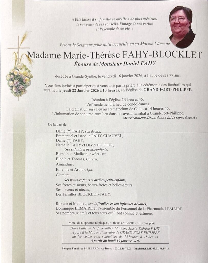 Madame FAHY, reposera au salon funéraire de GRAND-FORT-PHILIPPE, les visites se feront à partir du lundi 19 janvier 2025 de 15 heures à 18 heures.