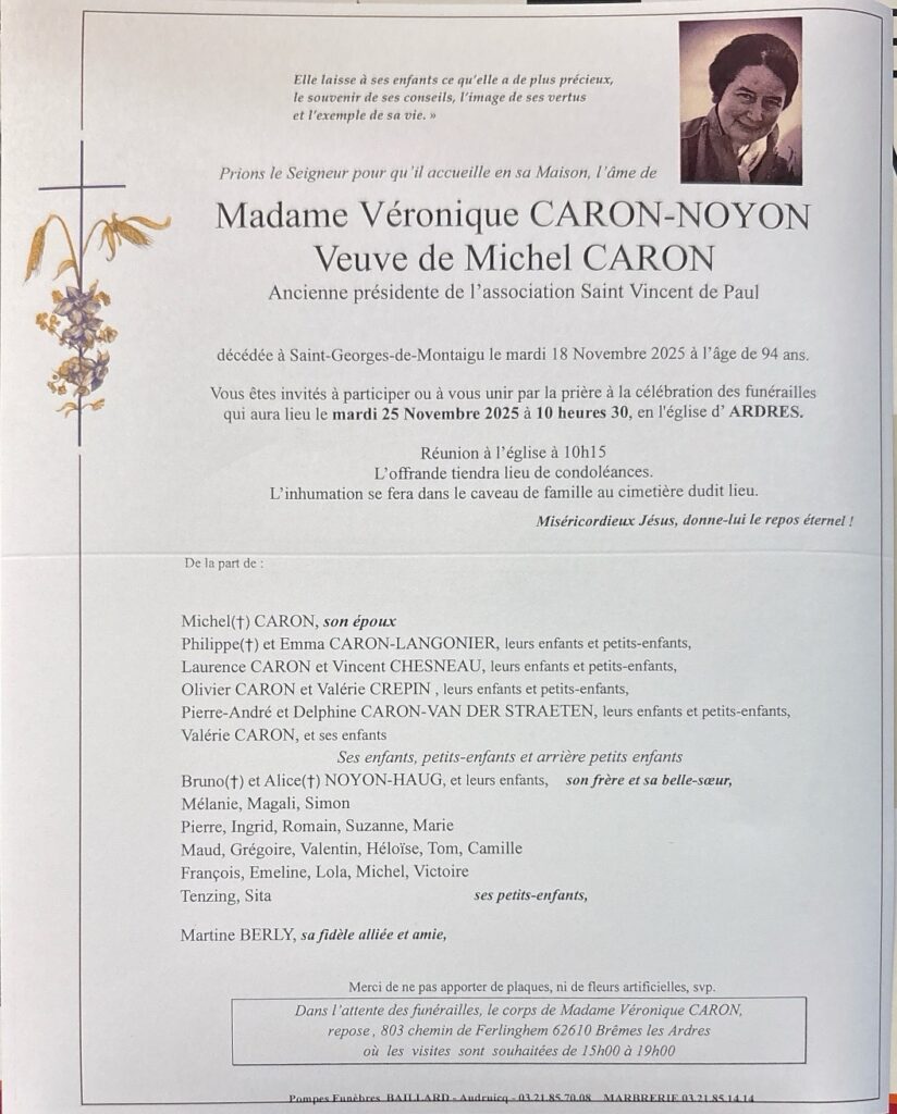 Madame Véronique CARON repose au domicile, 803 Chemin de Ferlinghem, 62610 BRÊMES LES ARDRES.
